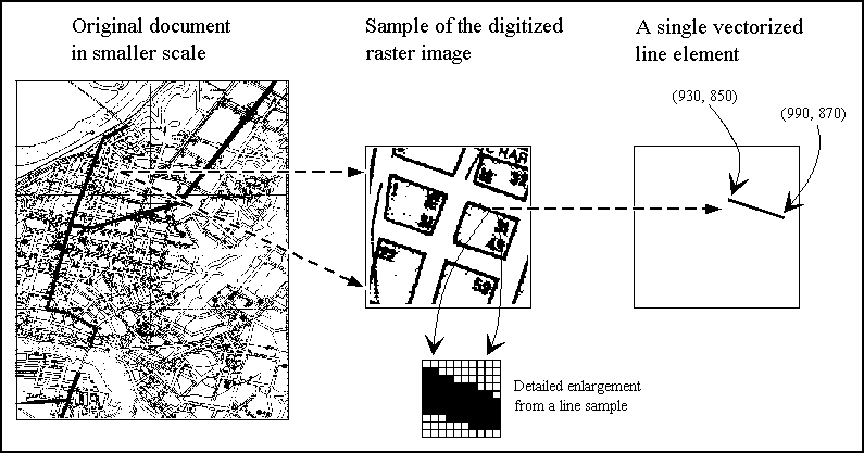 Karttakuvan vaihtoehtoiset esitystavat: rasteri- ja vektorimuoto.