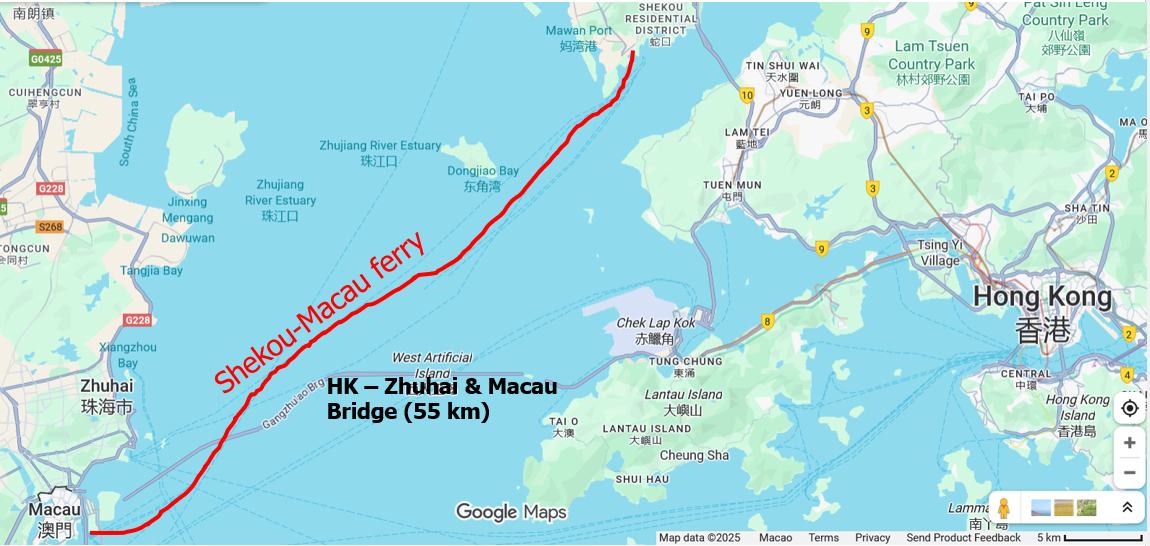 Macaohon pääsee Hong Kongista maailman pisintä (55 km) merisiltaa pitkin, mutta Shenzhenistä kätevin tapa on silti lauttayhteys. Ensin