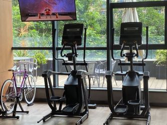 Kuvan kuntosali löytyy Moxy-hotellista ja muista poiketen siellä on myös kuntopyörä, hieman erikoisen näköinen mutta kuntopyörä
