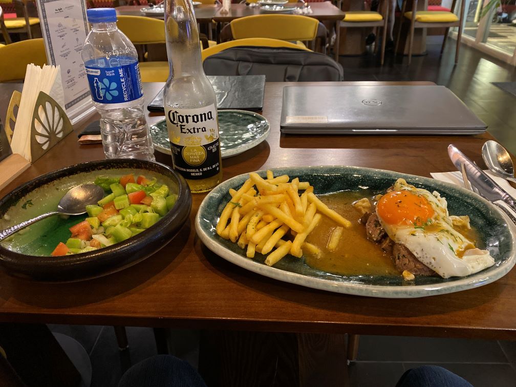 Kisan jälkeen lepäilin hotellilla ja vilvoittelin uima-altaalla. Illan suussa kunnon pihvi (kananmuna alla piilossa) samalla ravintola-kadulla,